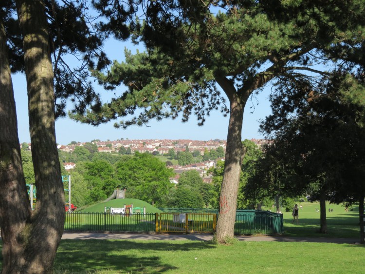 You will arrive in Victoria Park, one of Bristol’s largest city parks, which straddles the hilltop here. The park was created by the Wills Tobacco company, which then dominated employment in the Bedminster area, in a philanthropic gesture. Today, the well-used park offers three children’s playgrounds, a basketball court, football pitches, a wheels park, a water maze and many opportunities for walking, running and fitness training. To the left, glimpses of the distant city centre can be seen between the tall trees. There are some pretty basic toilets available in the two-storey park lodge just inside the gates.