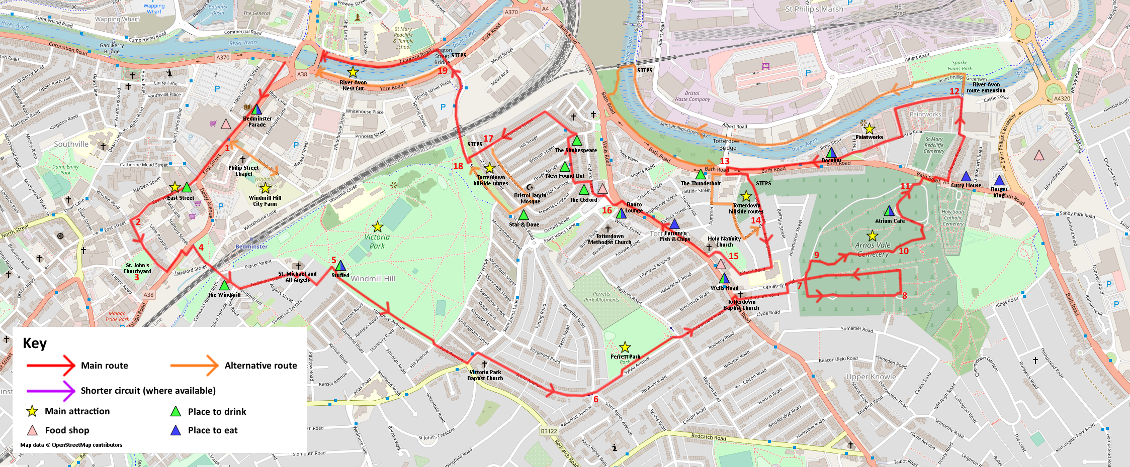 Key Attractions: Windmill Hill City Farm, East Street shops, Victoria Park, Perrett Park, Arno’s Vale Cemetery, Paintworks, Totterdown hillside routes, River Avon New Cut.