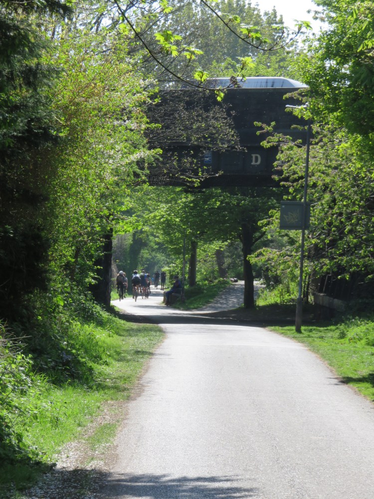 Turn right along this leafy route, watching out for high-speed cyclists.