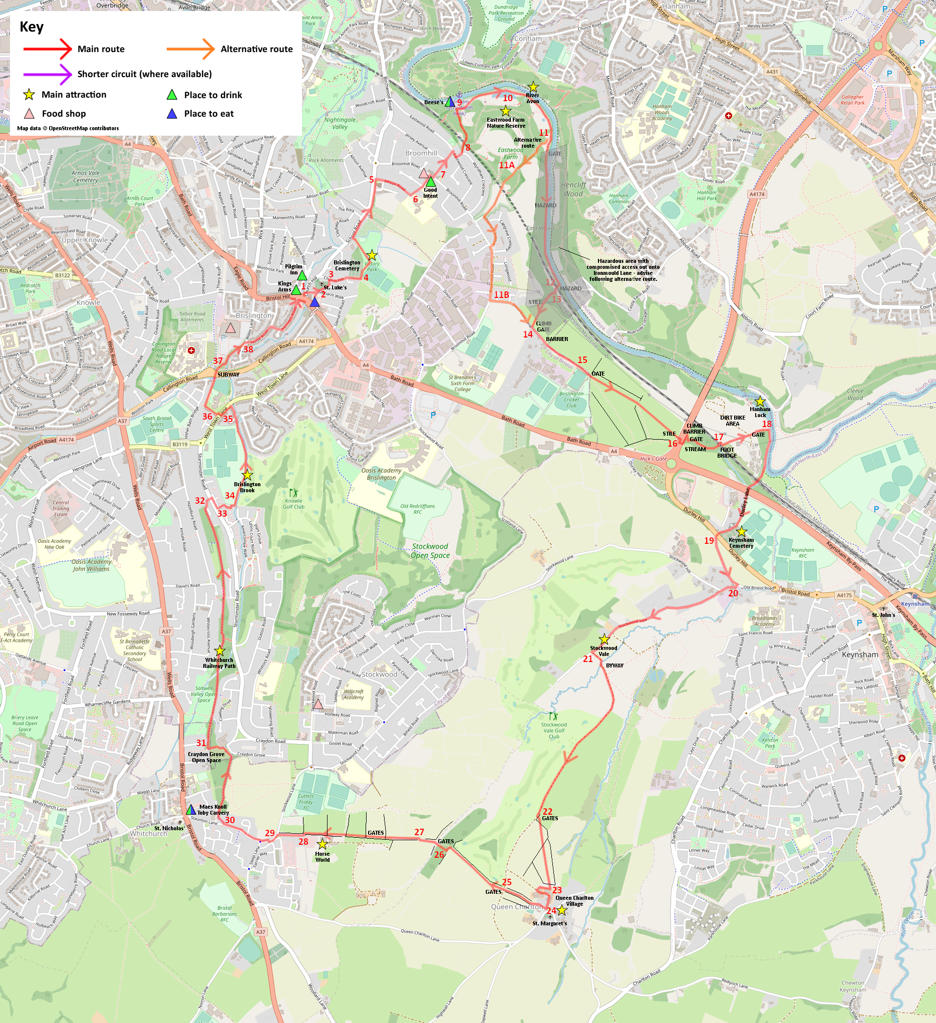 Refreshments: There are pubs near the starting point in Brislington and a carvery in Whitchurch. Food stores are available in Brislington near the start and end of the route, and also via a detour into Stockwood.