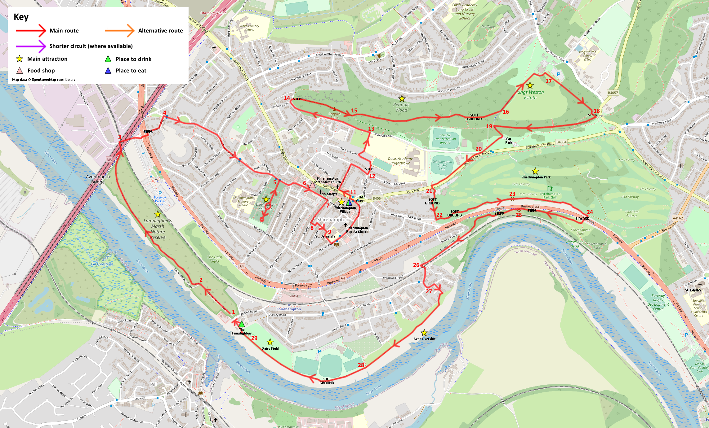 Refreshments: Pub at the start and finish of the route and a variety of food and drink options in Shirehampton Village.