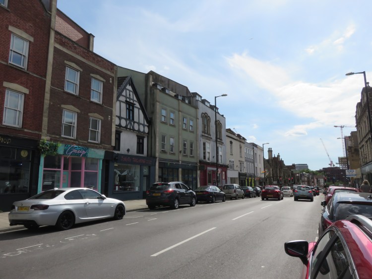 West Street is part of the main A420 running through the Old Market area. Economically, Old Market is a shadow of its former self. It was once a busy thoroughfare leading directly into the city’s main shopping district, but these days it is cut off from the rest of the city centre by the Temple Way Underpass and Castle Park. However, the area still contains a number of fine historic buildings, and in recent years has developed a new role as Bristol’s ‘gay village’. Looking to the right, you may catch a glimpse of the Trinity Centre, occupying a former church with ornate corner towers.