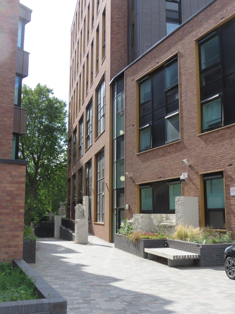 Like Portwall Lane earlier, Rivergate follows the line of the Portwall. The first seating unit contains a glass inspection window, through which you can look down on some of the Portwall stonework preserved below (8).
