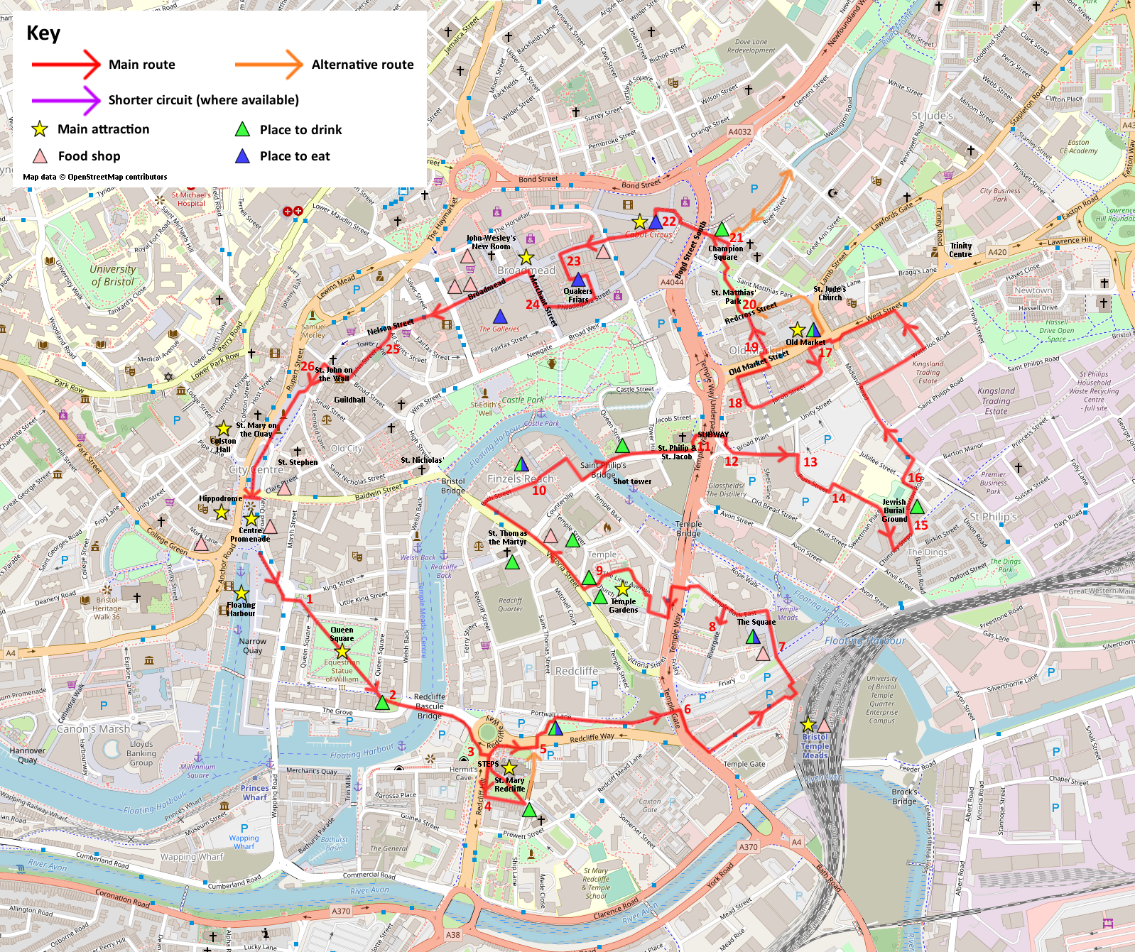 Refreshments: Pubs available at various points en route. Food available at some of these pubs and also a wide range of food options in the Broadmead and Cabot Circus area.