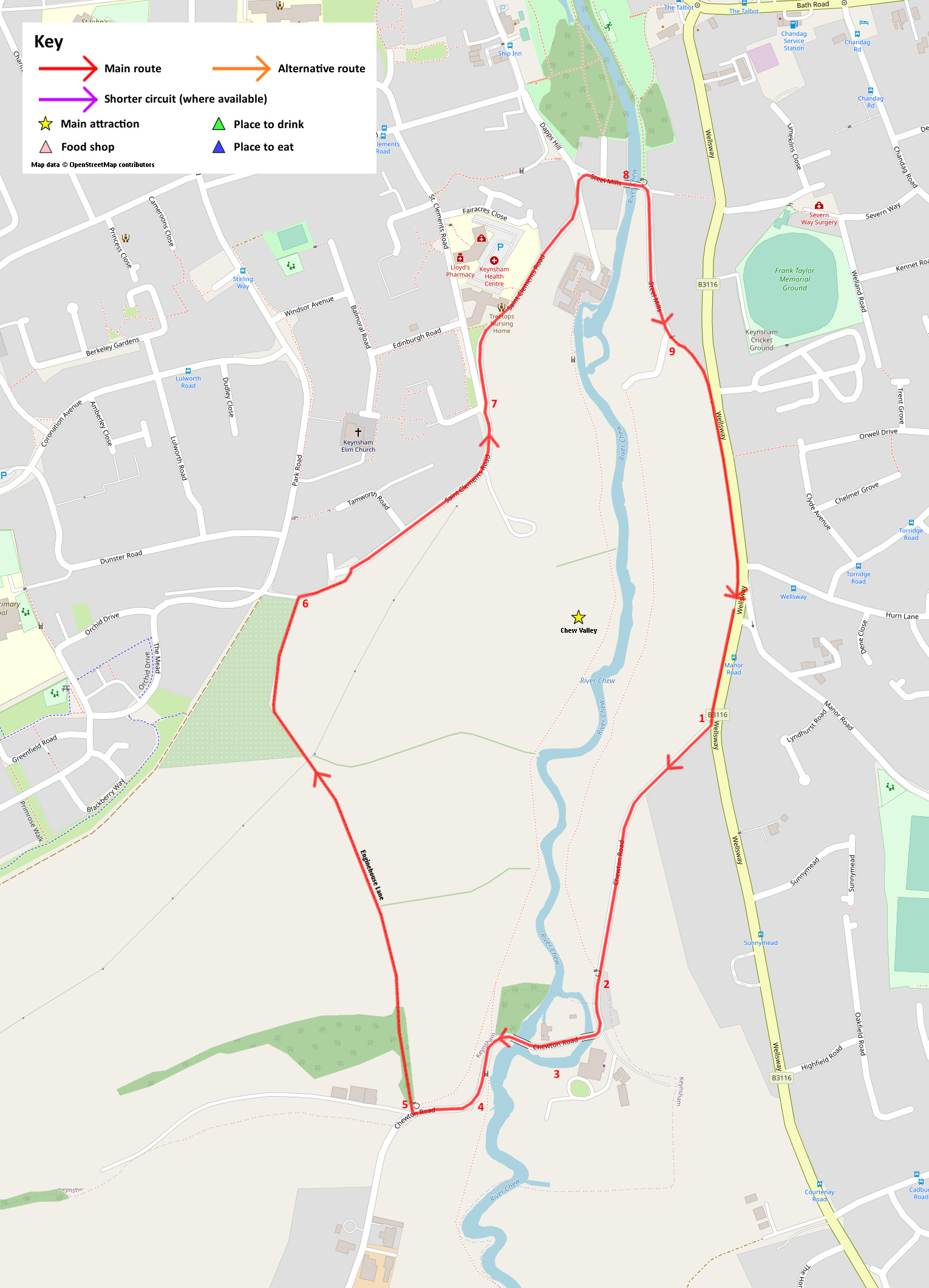 Getting there: The starting point is a fairly short walk through the historic town centre from Keynsham Station. On-street car parking available in Manor Road.