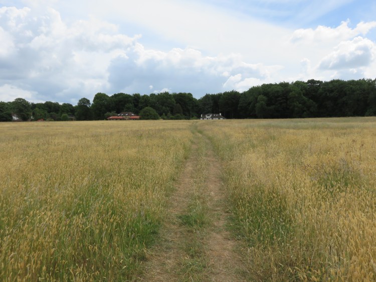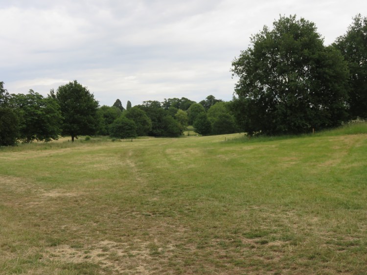 When the track emerges again from the woods, bear left and follow the grass around the edge of the trees until you pass through a gate into the lower edge of the estate. Trace a course roughly straight on across the grass, keeping to the left of the narrow patch of trees and scrub ahead of you.