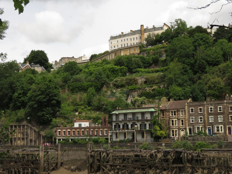 Your view across the water continues to evolve as you follow the path. At first you can see the Northern Entrance Lock for the Cumberland Basin and the Plimsoll Swing Bridge that carries the main road over it. You can also see the eclectic terraces of Hotwell Road (including the low-slung Georgian Colonnade, last surviving fragment of the Hotwells spa) and the battered and buttressed façade of the lower station of the Clifton Rocks Railway (see Walk Six ‘The Clifton Hillside’). Behind the terraced houses, below the imposing Avon Gorge Hotel, some interesting terraced gardens climb the side of the gorge.
