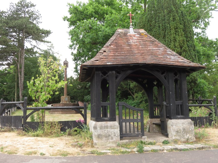 You will pass the church of St. Mary the Virgin (23). The church is set back from the Vicarage Road and hidden among the trees, but its traditional lychgate dominates the junction.