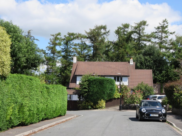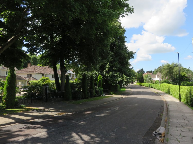 The path will eventually bring you out onto Elmlea Avenue. You have now entered a very comfortable residential area that is characterised by large detached houses and high green hedges. There are also several beautiful specimen trees, with varieties of pine, cypress and cedar being fairly common alongside more usual garden species.