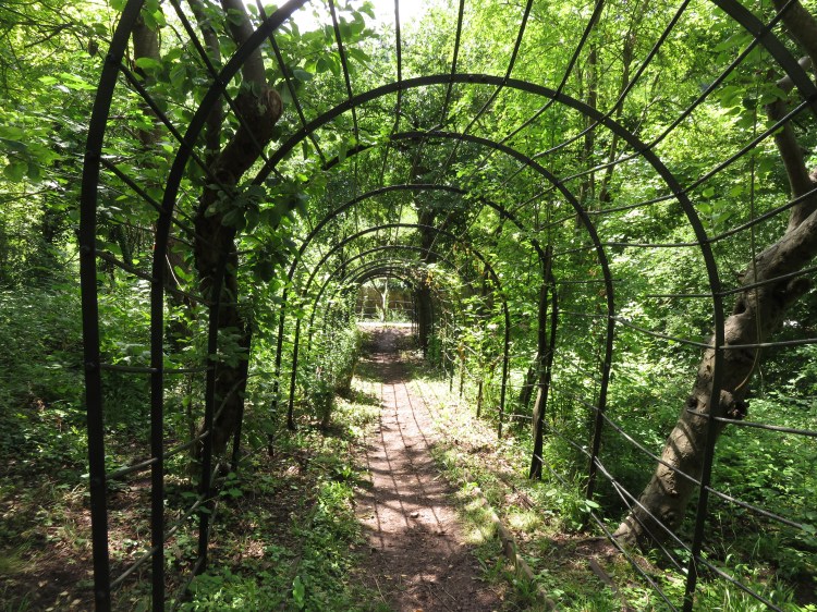 You are on the middle level of the gardens. You can explore the upper and lower levels if you wish; an old metal arbor runs back down to the bottom of the garden, while a flight of stone steps ascends to an upper level where you can find the remains of a stone summerhouse. There are further levels even higher up, currently inaccessible but under gradual restoration. Return to the middle level when you’ve finished.
