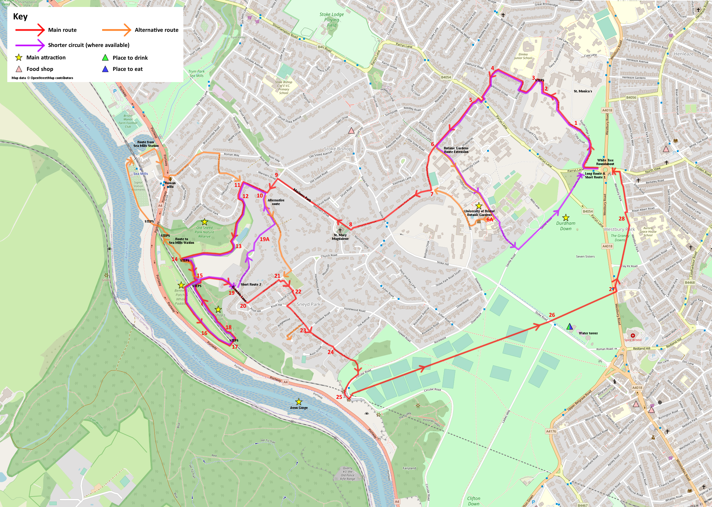 Starting point: White Tree Roundabout, Westbury Road/North View (Long Route and Short Route 1); Bramble Lane, Sneyd Park or Sea Mills Station (Short Route 2).