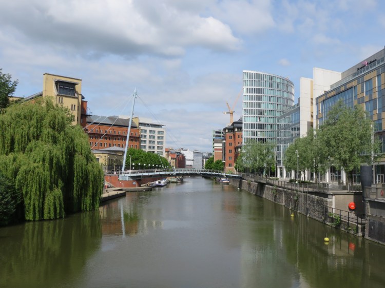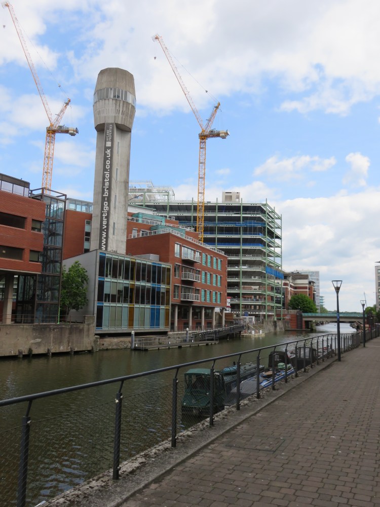 A few narrow boats have taken up residence in the otherwise modern, commercial surroundings here. This part of the Floating Harbour is known as Temple Quay, and has been the focus of much of the city’s 21st Century office development. The most iconic structure in the area is the curving Valentine’s Bridge. On the far side of the water you will see an unusually shaped residential tower block called ‘The Eye’.
