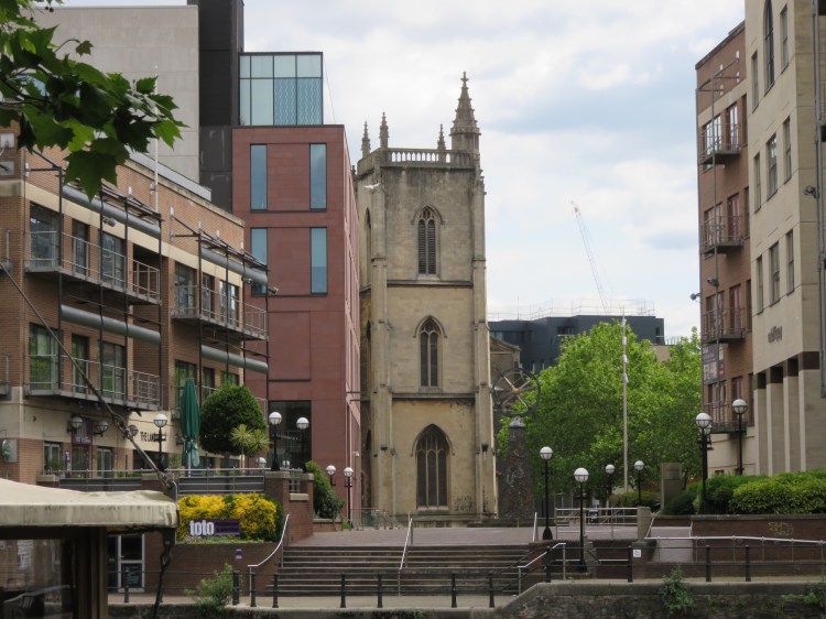 Beyond Bristol Bridge, as the quayside walkway continues, you will find yourself opposite Castle Park on the other side of the Floating Harbour. The ruined church in the middle of the park is St. Peter’s, which we will get a closer look at later on.