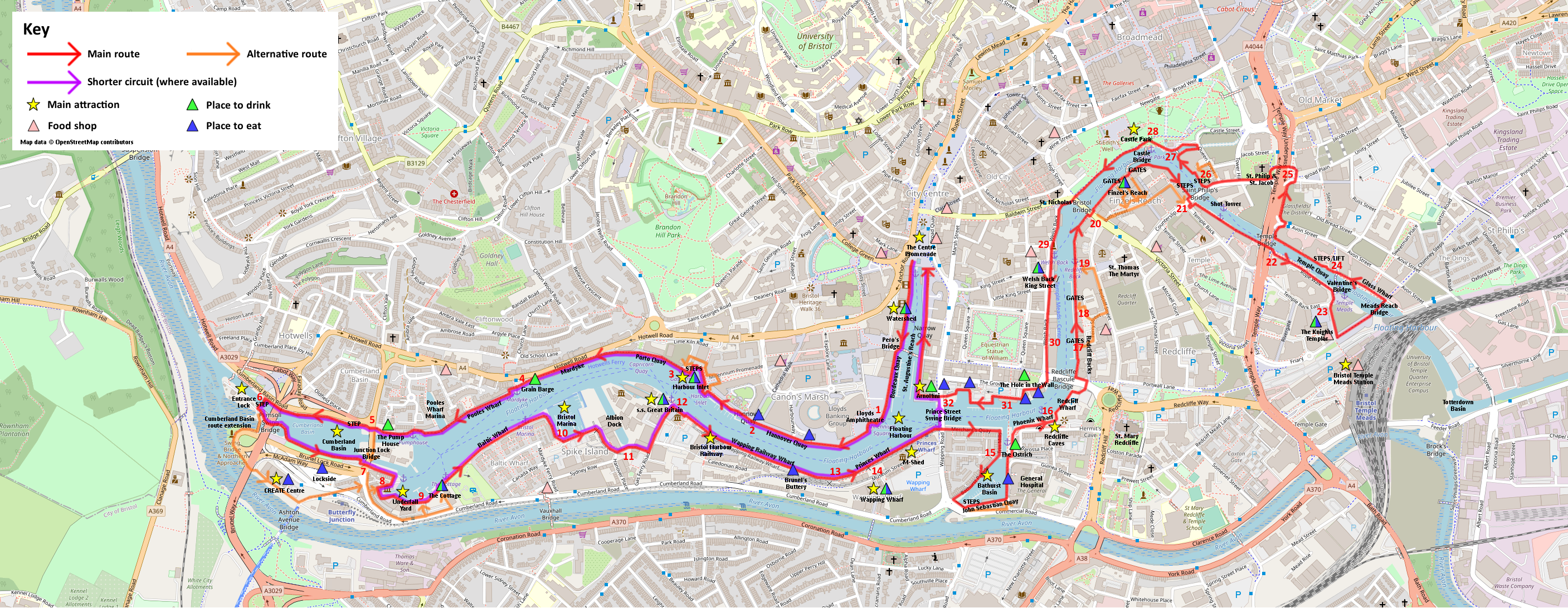 Key Attractions: The Centre Promenade, Floating Harbour, Watershed, Harbour Inlet, Cumberland Basin, Entrance Locks, CREATE Centre (via optional extension), Underfall Yard, Bristol Marina, s.s. Great Britain, Bristol Harbour Railway, Wapping Wharf, M-Shed museum, Bathurst Basin, Redcliffe Caves, Temple Meads Station, Castle Park, Arnolfini art gallery.